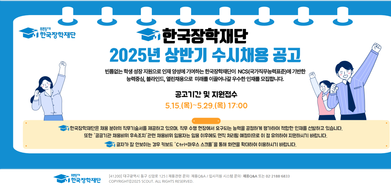 한국장학재단이 2025년 상반기 수시채용에 나선다. 채용 인원은 5명으로 행정직, 미화, 사서, 운영지원 등 다양한 직무가 포함됐다.